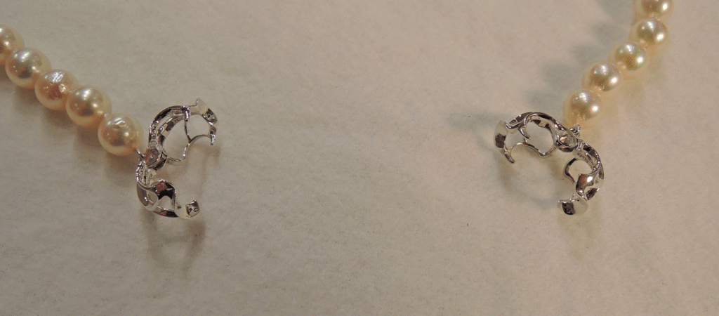 お客様のアイディアで、ネックレスの両端にパックボールという真珠を抱え込むパーツを取り付けました。