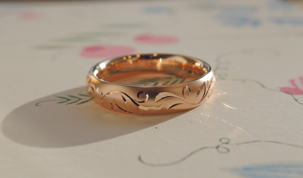 お客様は、K18PGでセミラウンド型。そこに彫金で模様を入れられました。模様を際立たせるため、表面はマット加工してあります。