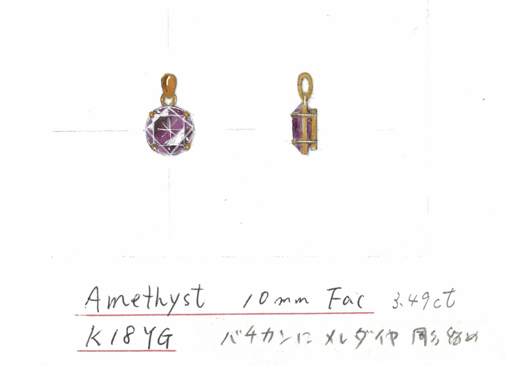 お客様のご希望は、直径約10mmのアメジストを楽しみたいので、石枠にバチカンをつけただけのシンプルなものにしたいとのことでした。